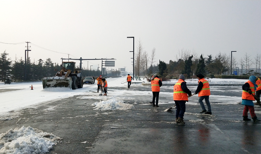 由于28日最高氣溫只有1度,路面積雪很難融化,當(dāng)天又恰逢周末,是居民大量外出的時段。為了確保人、車流高峰期間交通安全,華茂公司職工放棄周末休息,精心組織,緊密協(xié)調(diào)。從早上7點起,就組織工人在花果山大道、黃海大道、東方大道、新光路下穿涵洞、火車站匝道等路段撒布氯化鈣,加速積雪融化,防止路面低溫降雪產(chǎn)生冰凍,為及時掃除冰雪和確保居民正常出行提供保障。該公司組織職工近300人次,鏟車、平板車、裝載機、工程車輛等作業(yè)機械十余臺(班)投入到掃除積雪工作中去,使用氯化鈣十余噸。截止28日下午4時,經(jīng)過近一天的緊張作業(yè),各條主干道積雪基本清理完畢,道路恢復(fù)通暢。