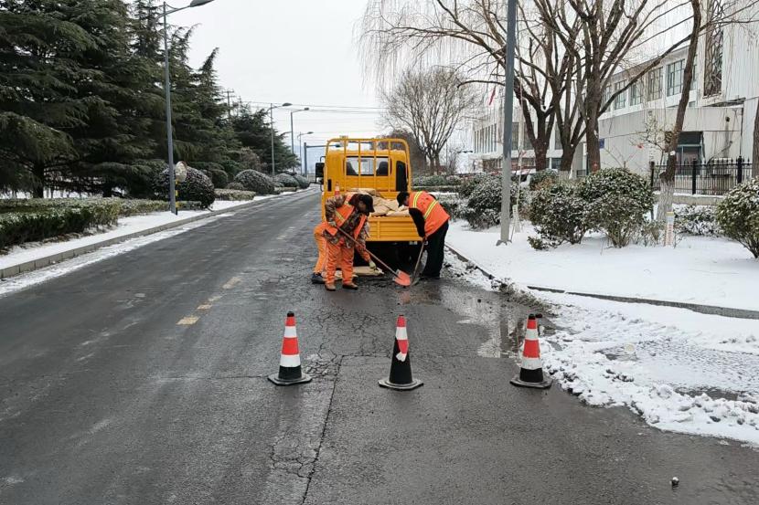 在排患工作中,盛達(dá)市政分公司安排2個“道路應(yīng)急搶修小組”分頭行動,按照巡查組發(fā)現(xiàn)的情況,逐點對雪后道路坑窩等病害迅速展開搶修??紤]冬季氣溫低,不適合傳統(tǒng)熱瀝青修補(bǔ)方式,該公司為盡快解決安全通行問題,決定使用修補(bǔ)王、冷瀝青墊平等應(yīng)急措施,先對道路坑窩、裂痕等進(jìn)行臨時性維修,該公司在臨時修補(bǔ)完成后,還對維修點位建立了養(yǎng)護(hù)維修臺賬,以便事后巡查及養(yǎng)護(hù),防止點位出現(xiàn)二次病害情況發(fā)生。